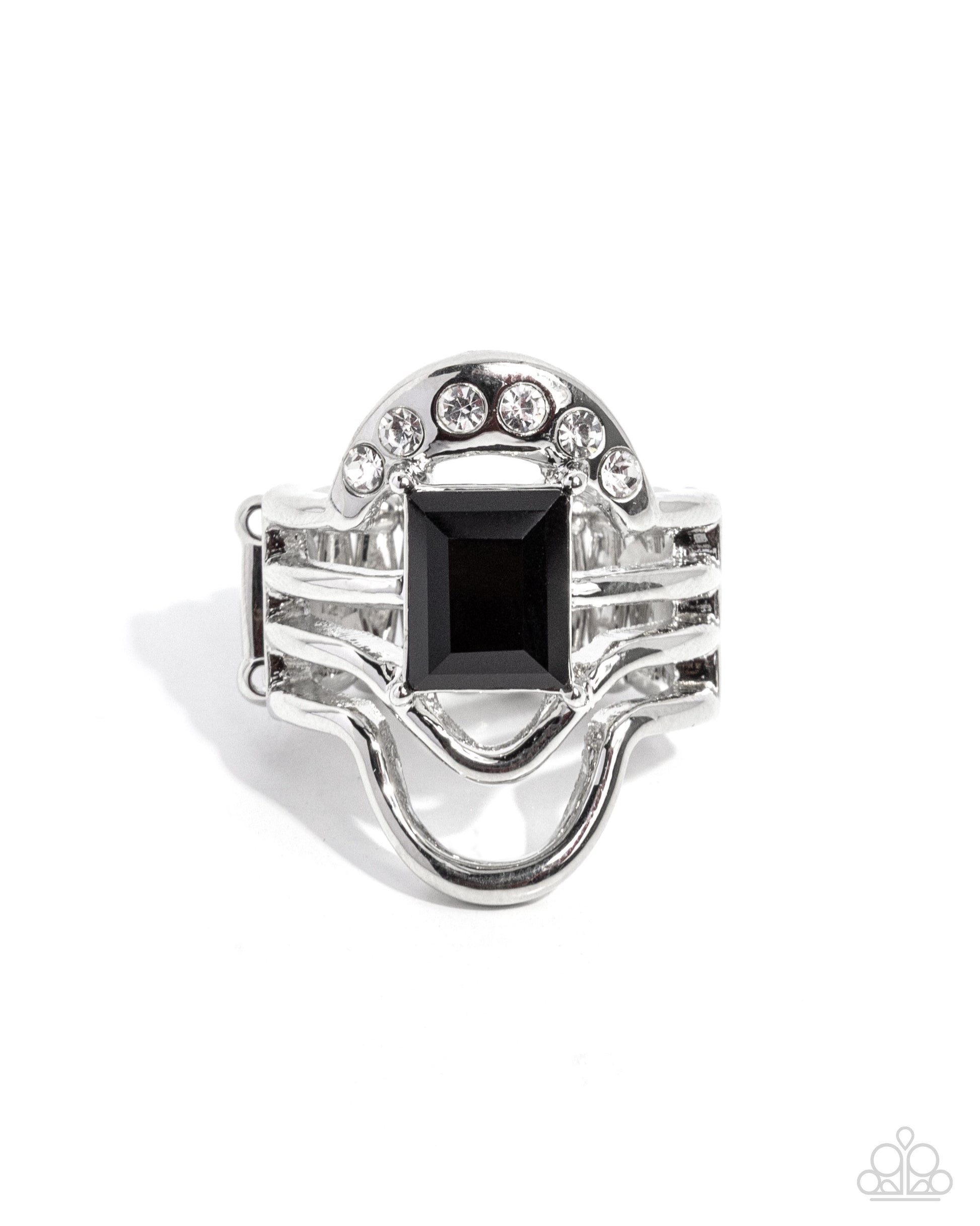 Featuring silver bars that curve up and below the finger, a collection of dainty white rhinestones crowns a silver-pronged faceted black square gem for a standout shimmery display. Features a stretchy band for a flexible fit.