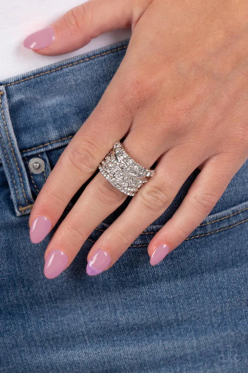 Row after row of radiantly mismatched dainty white rhinestones haphazardly stack across the finger, coalescing into a dramatic display of dazzle against a textured silver background. Features a stretchy band for a flexible fit.