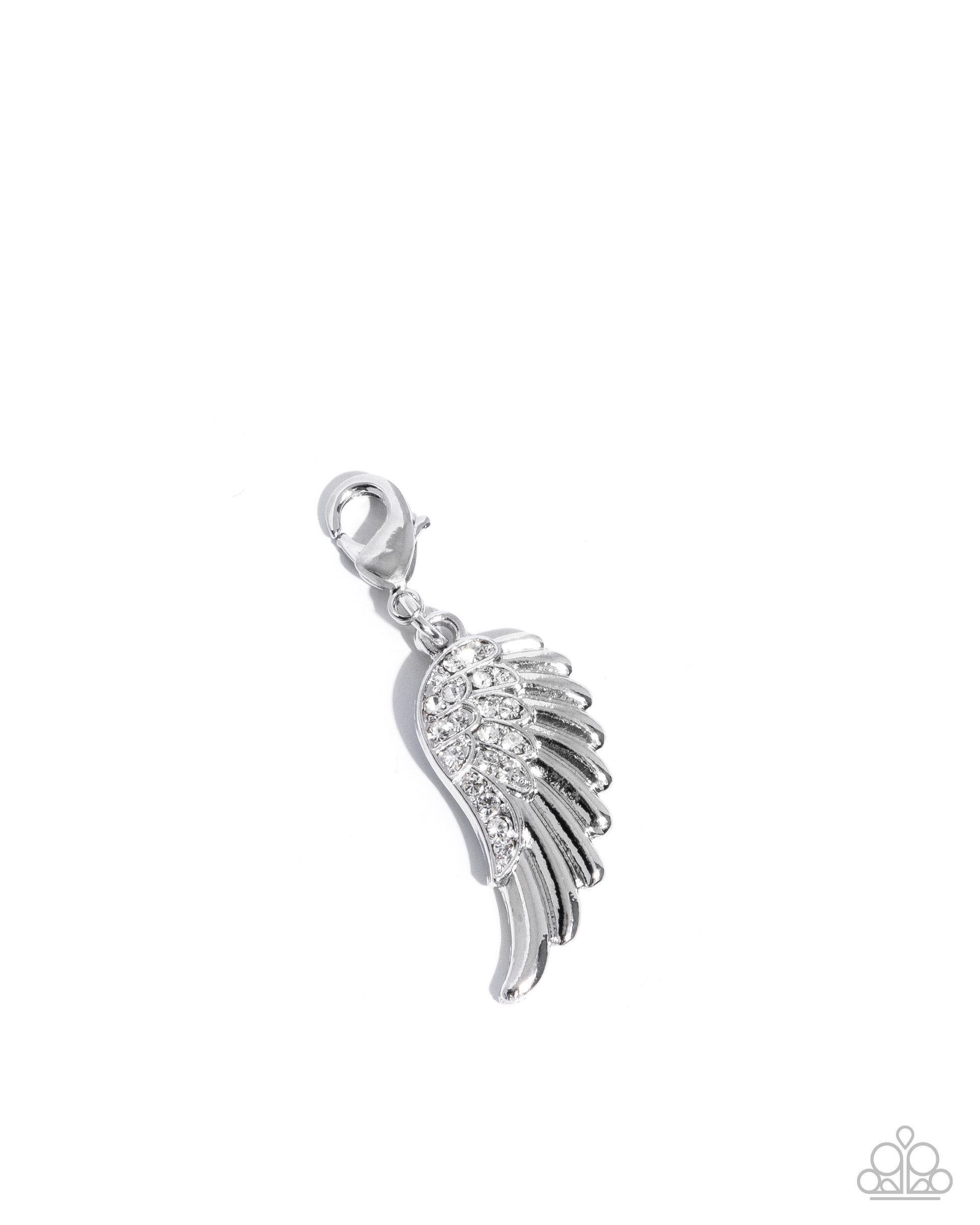Dusted in white rhinestones, a rhodium plated angel wing reflects light in every direction. Features a clasp closure. Can be attached to a variety of chains for a celestially chic look. Charm measures approximately 1" in length.