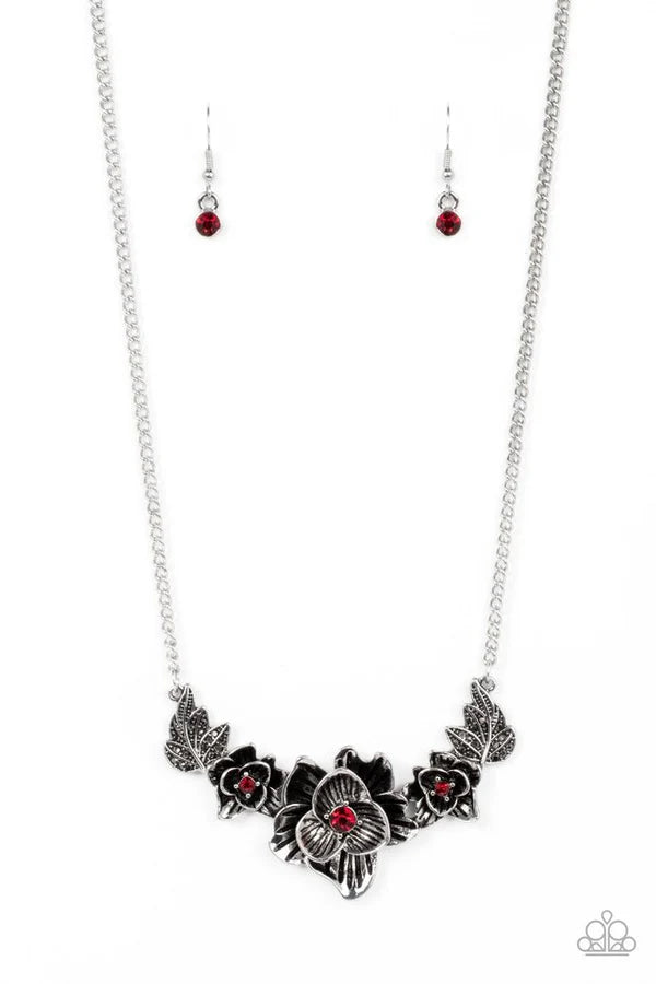 Dainty hematite rhinestones are sprinkled across leafy silver frames that branch out from a trio of mismatched silver floral frames dotted in dainty silver studs and fiery red rhinestones, resulting in a beautiful botanical centerpiece below the collar. Features an adjustable clasp closure.