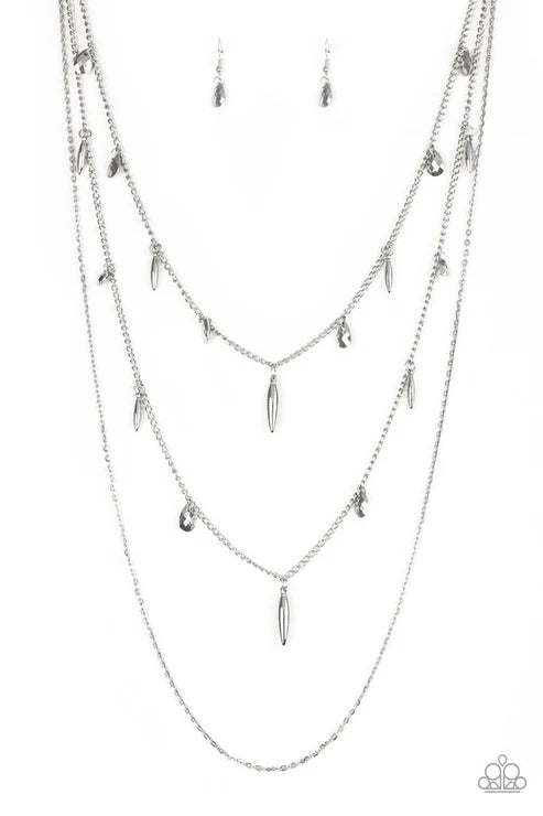 Mismatched silver chains layer down the chest. Faceted silver teardrops and shiny silver accents swing from two of the shimmery silver chains for an edgy finish. Features an adjustable clasp closure. Sold as one individual necklace. Includes one pair of matching earrings.