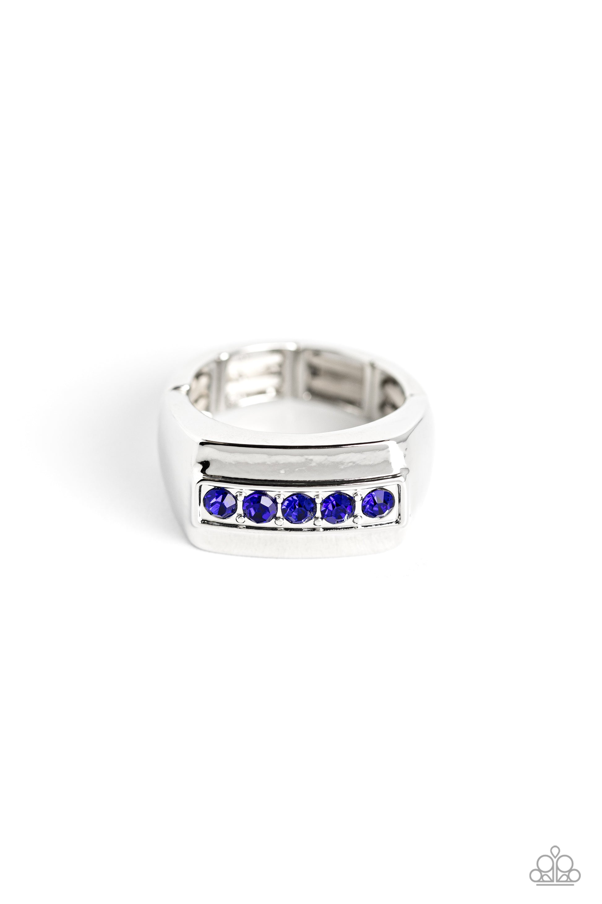 A single row of glassy sapphire rhinestones and silver studs is encrusted along the center of a thick rectangular silver band for an understated pop of color atop the finger. Features a stretchy band for a flexible fit.