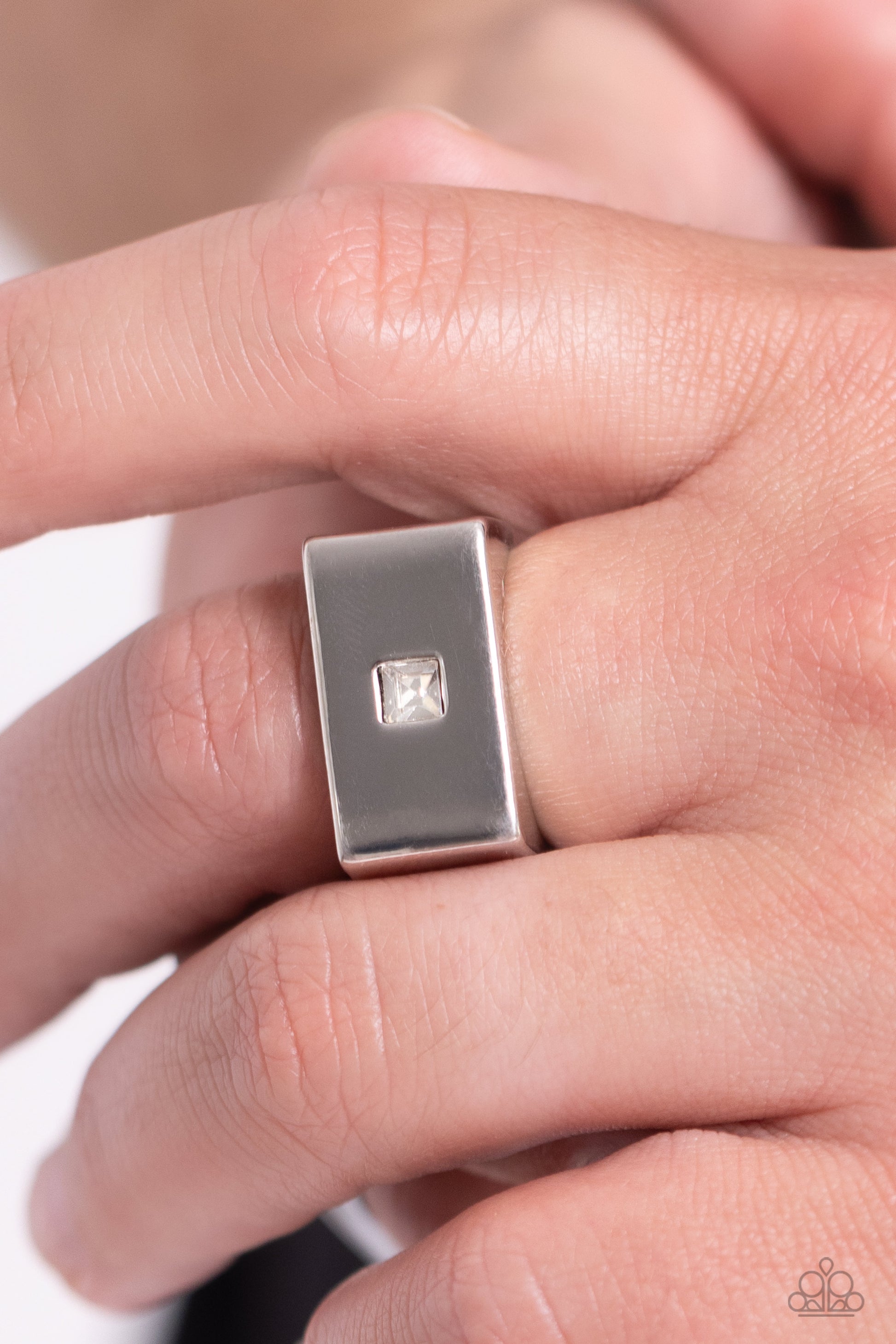 Featuring a kingly square-style cut, a white rhinestone is pressed into the center of a flat rectangular silver frame for a statement look. Features a stretchy band for a flexible fit.
