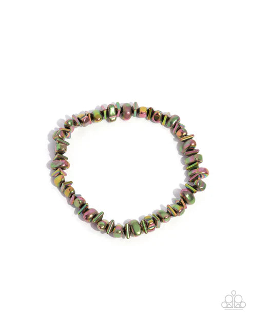 Infused along an elastic stretchy band, a collection of oil spill-brushed pebbles alternates with oil spill chiseled beads along the wrist for a uniquely urban statement.