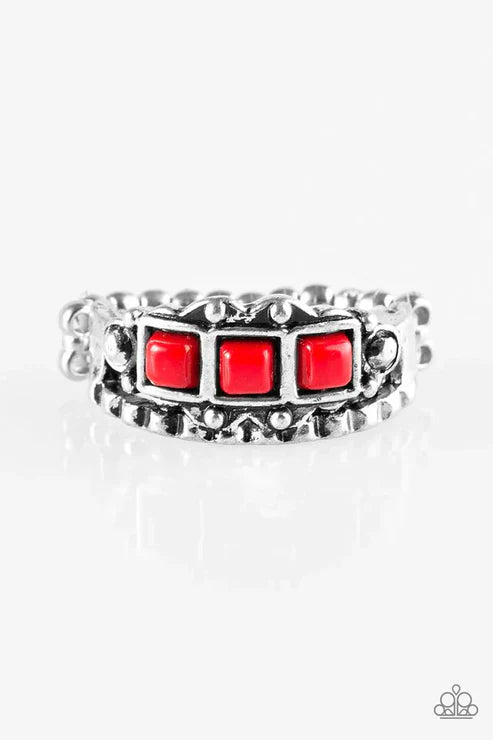 Featuring a square cut, Neutral red beads are pressed into a dainty silver band radiating with tribal inspired textures. Features a dainty stretchy band for a flexible fit.