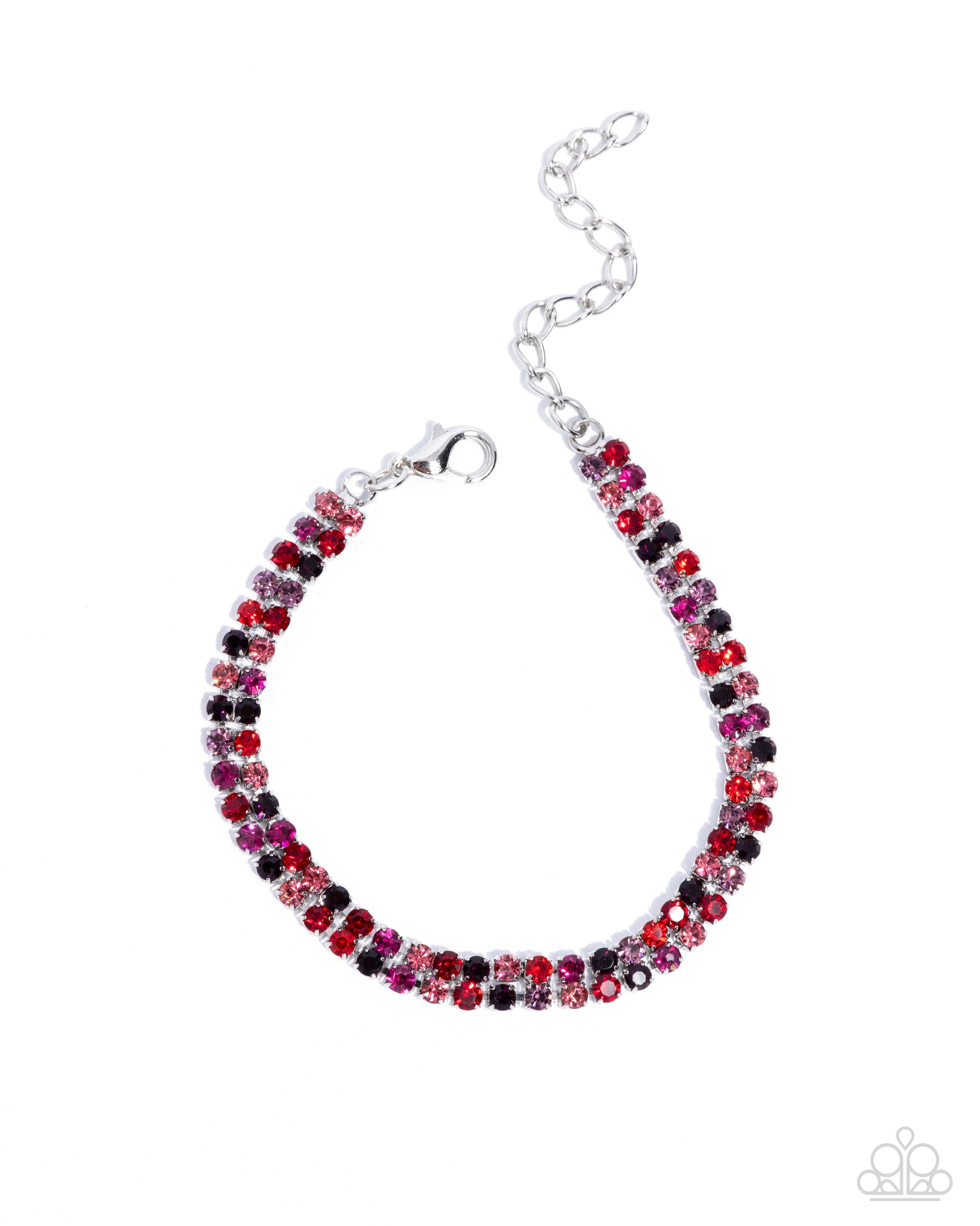 Featuring sleek square fittings, strands of glittery red multicolored crystal-like and faceted rhinestones coalesce into a regal display around the wrist. Features an adjustable clasp closure.