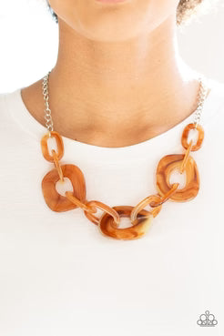 Brushed in a faux-marble finish, bold brown links connect below the collar for a statement making look. Features an adjustable clasp closure. Sold as one individual necklace. Includes one pair of matching earrings.