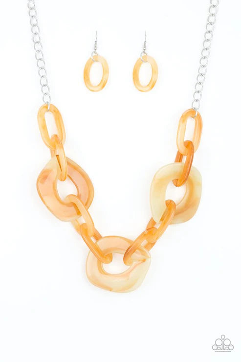 Brushed in a faux-marble finish, bold yellow links connect below the collar for a statement making look. Features an adjustable clasp closure. Sold as one individual necklace. Includes one pair of matching earrings.