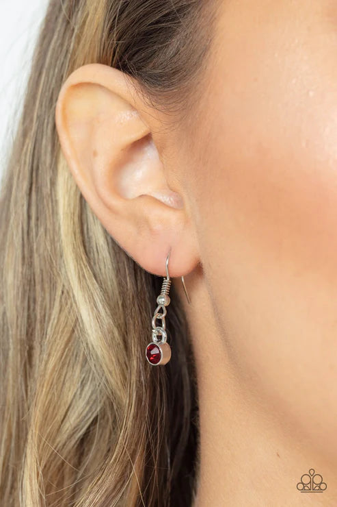 Plain silver and white rhinestone encrusted silver bars asymmetrically swoop and swirl around an oversized red teardrop gem, creating a dazzling pendant at the bottom of a lengthened silver chain. Features an adjustable clasp closure.