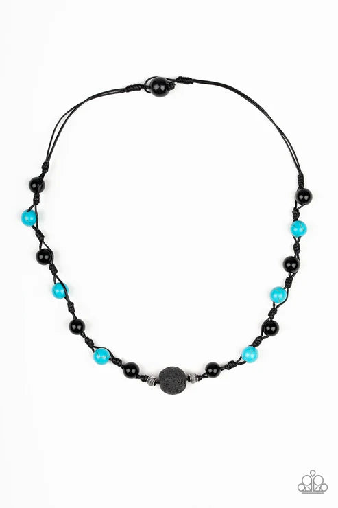 A collection of polished black beads and refreshing turquoise stone beads are knotted in place along a shiny black cord. Infused with dainty metallic accents, a black lava rock adorns the center of the piece for a seasonal finish. Features a button-loop closure.