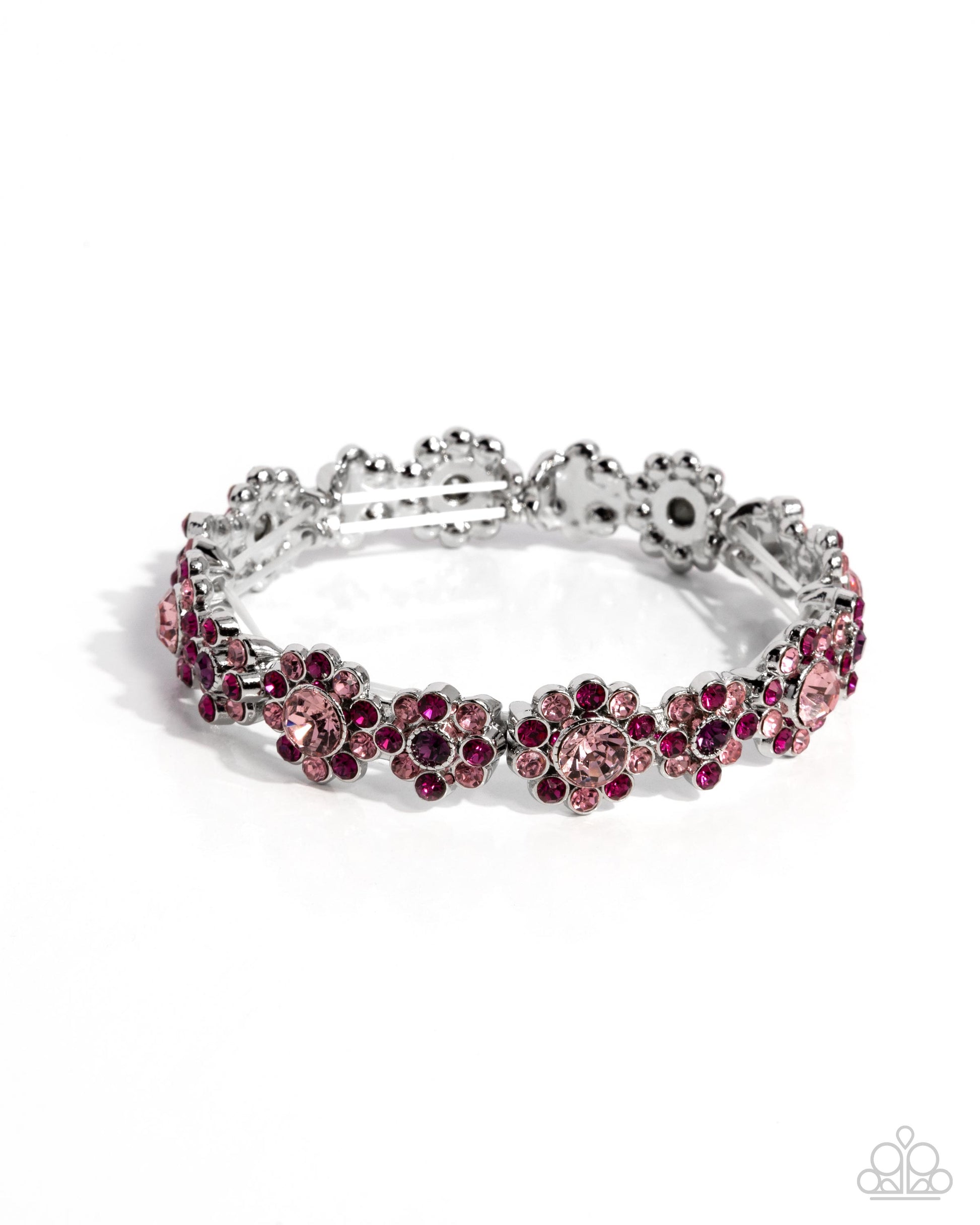 A collection of fuchsia and light rose rhinestones is pressed into the centers of floral frames, creating a sparkling arrangement around the bracelet. The dot motif surrounding each floral design enhances the bracelet's intricate look.
