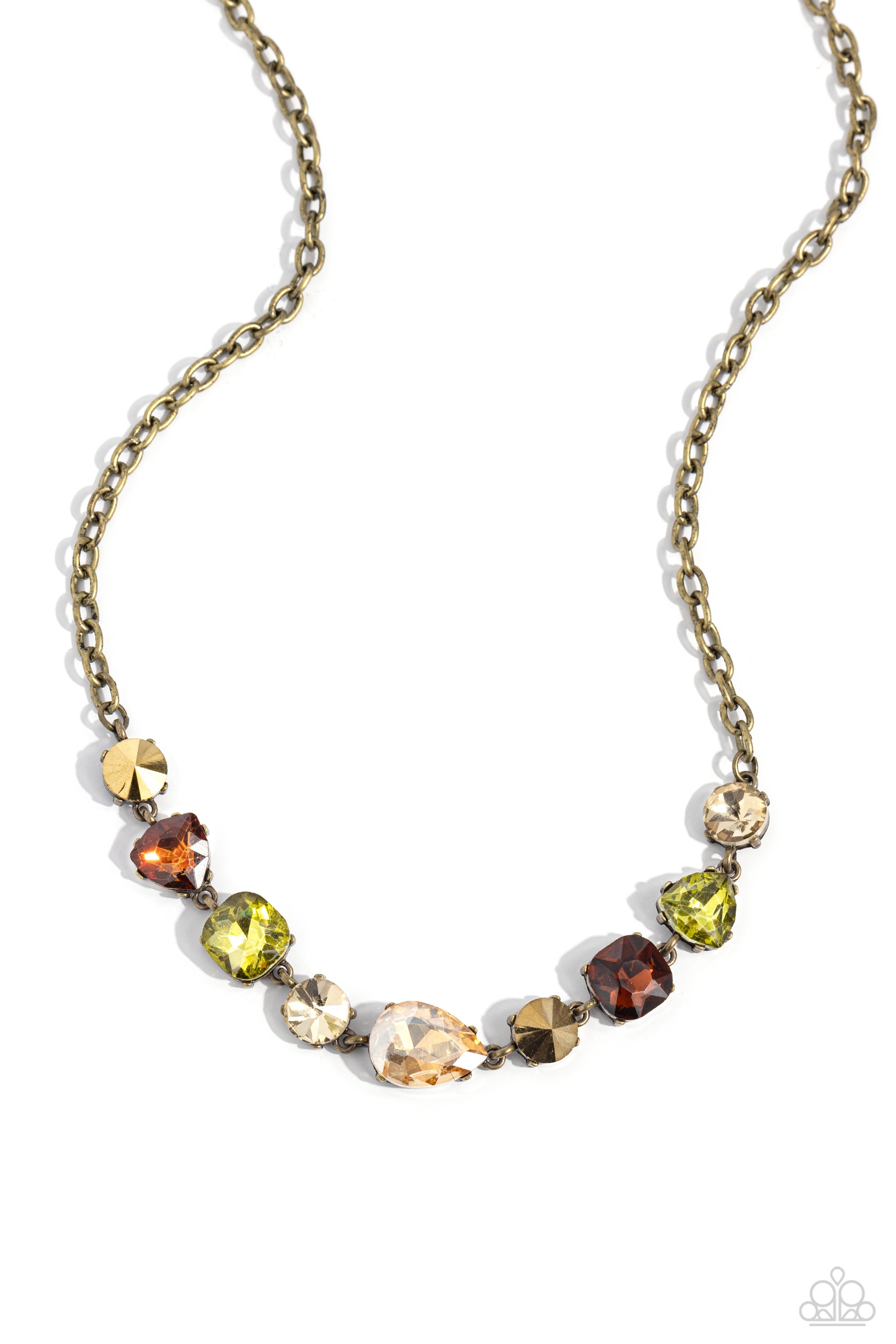 Set in brass-pronged fittings, glittering geometric aurum, topaz, olive, and champagne gem and acrylic shapes delicately coalesce around the collar on a sleek brass chain for an edgy statement. Features an adjustable clasp closure.