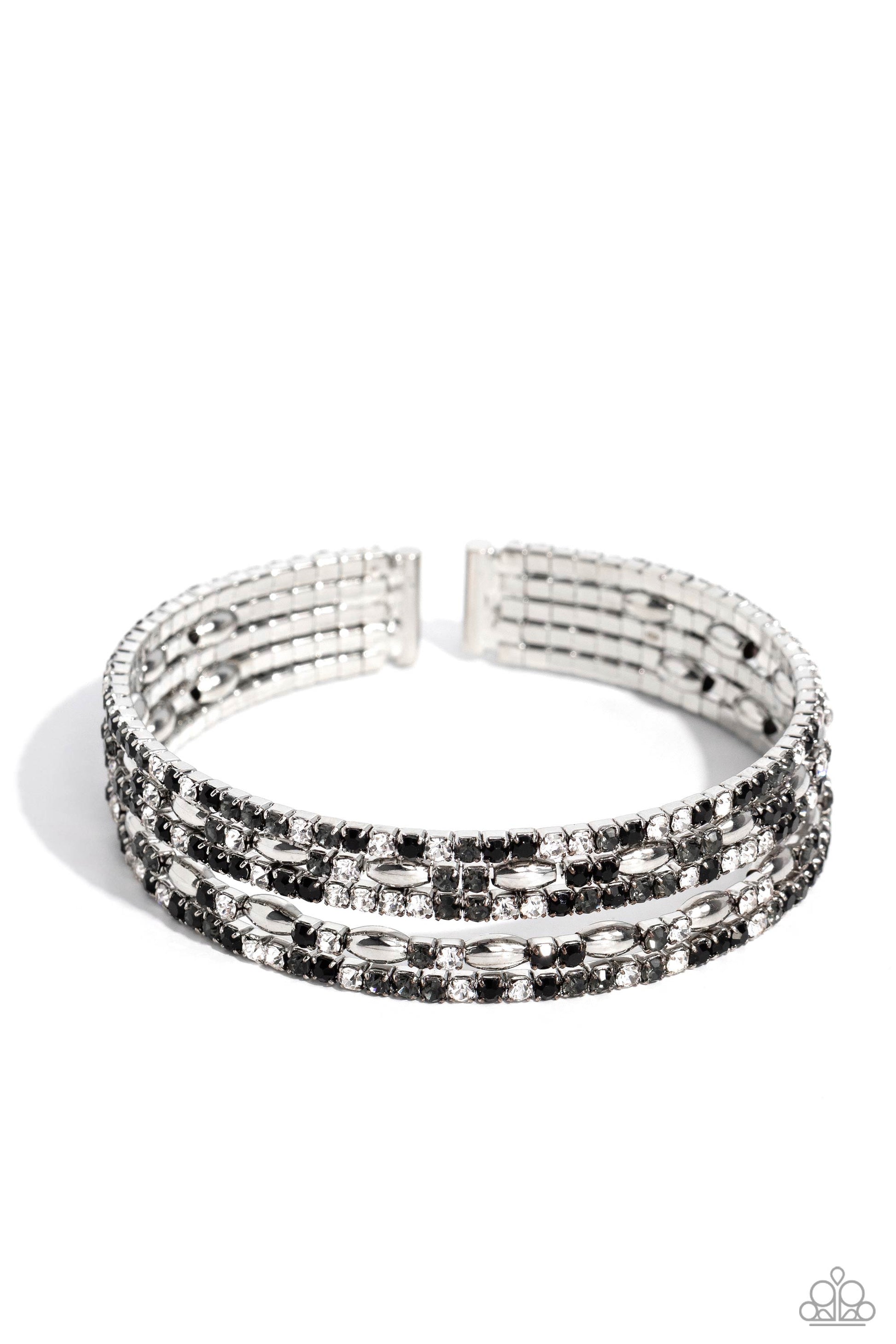 Four strands of dazzling white, black, and smoky rhinestones flank shiny silver accents, coalescing into a sparkly layered cuff around the wrist.