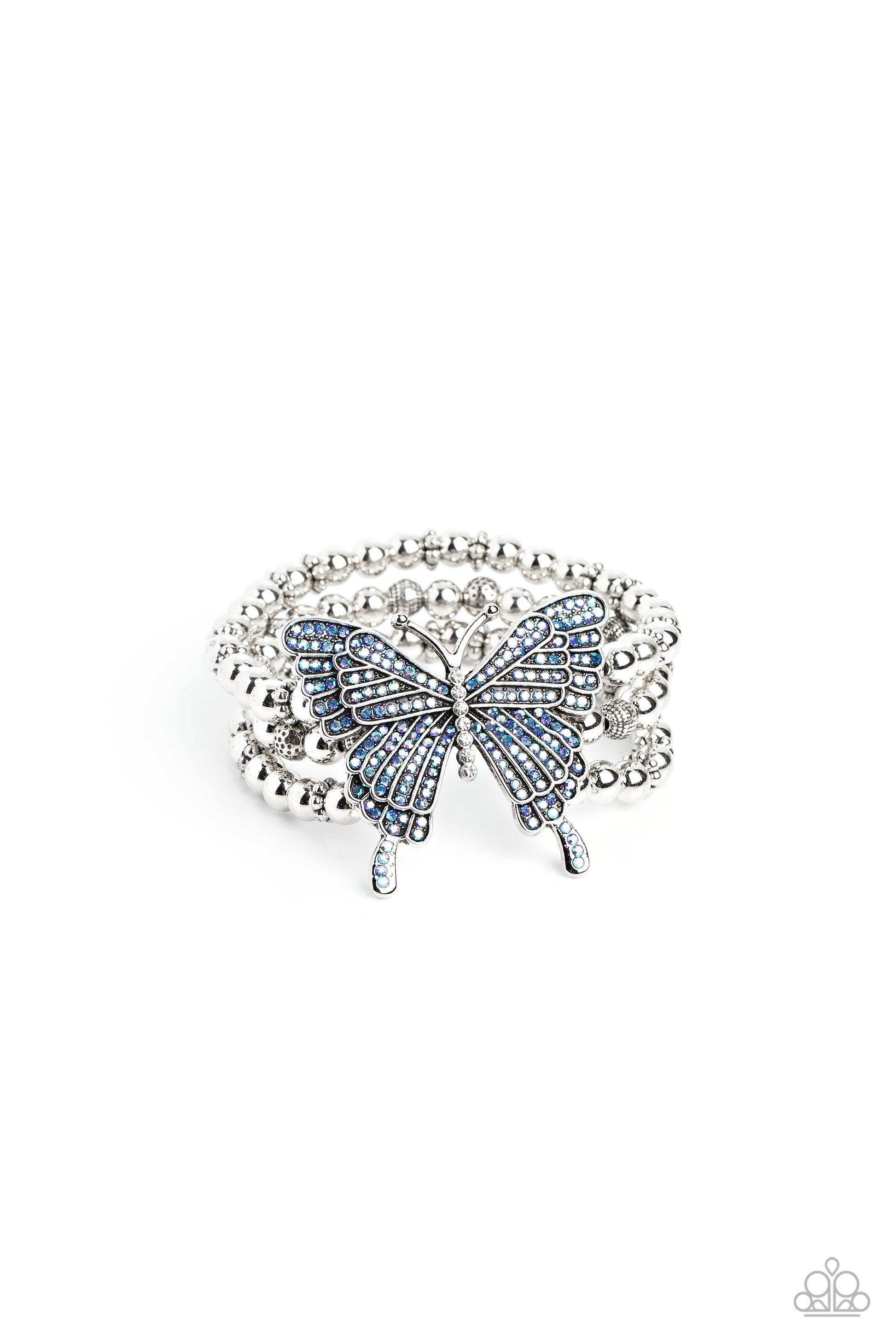 Strung along elastic stretchy bands, a trio of silver and textured silver beads and accents wrap around the wrist. Featured atop the beaded collection, an oversized silver butterfly, with intricate details, is sprinkled with dainty blue iridescent rhinestones across its wings and body, for a dramatically dazzling finish. Due to its prismatic palette, color may vary.