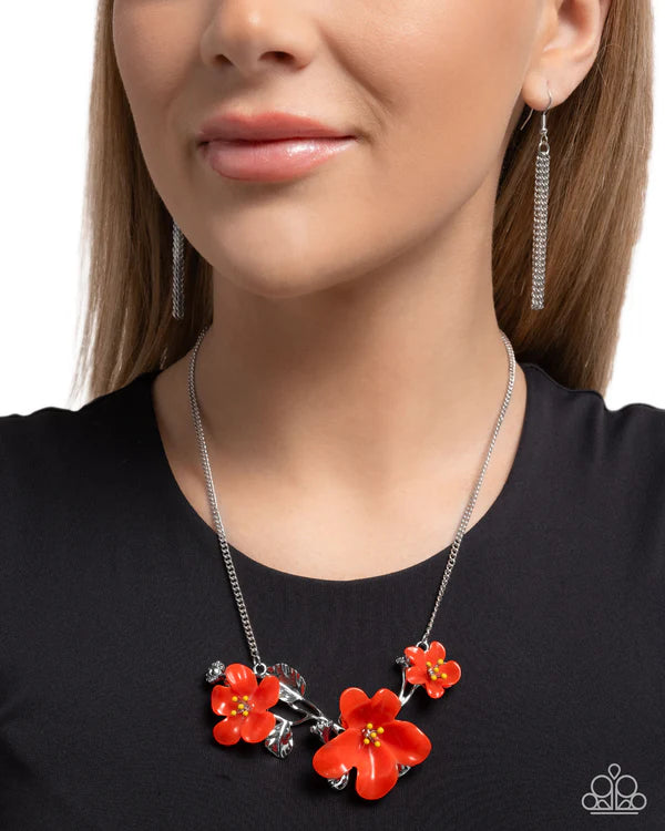 Featuring vibrant red paint, a trio of glistening flowers with yellow-painted centerpieces blooms below the neckline beside subtly textured silver leaves and vines from a classic extended silver chain for a wildly whimsical display. Features an adjustable clasp closure.
