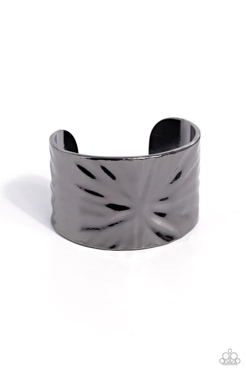 A thick band of gunmetal, featuring warped textures across its surface wraps around the wrist for a standout centerpiece, reflecting light off every fold.