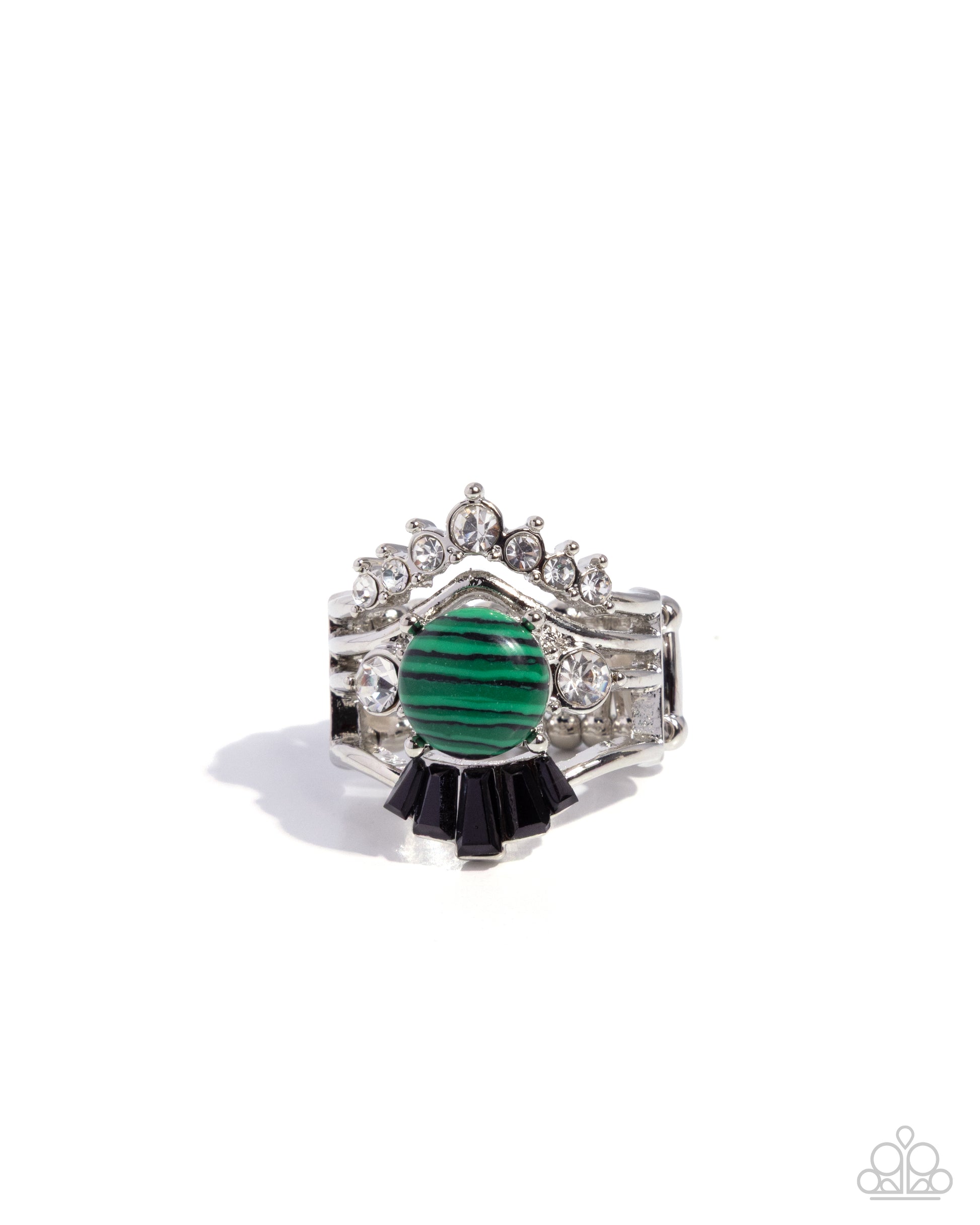 A collection of slightly curved silver bars coalesce atop the finger, showcasing a variety of elegantly eclectic accents, including a green-striped stone centerpiece, white rhinestones in varying sizes, and a collection of chiseled emerald-cut black gem bars in varying sizes for a standout look. Features a stretchy band for a flexible fit. As the stone elements in this piece are natural, some color variation is normal.