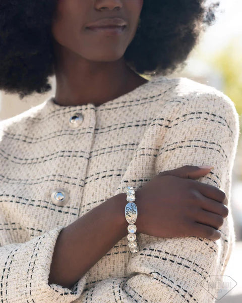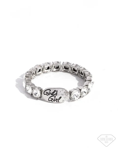 Infused along an elastic stretchy band around the wrist, pronged silver fittings featuring white gems glitter and glisten. An abstract silver oval pendant featuring dainty white rhinestones and the words, "God's Girl" creates an elegantly ethereal look.