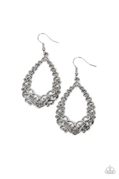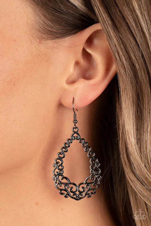 Glistening gunmetal vine-like filigree interweaves into an airy teardrop, resulting in a seasonal frame. Earring attaches to a standard fishhook fitting.