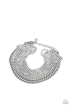 Strung between two gunmetal fittings, sparkly strand after sparkly strand of glittery white rhinestones layer around the wrist, creating a glamorous statement piece. Features an adjustable clasp closure.