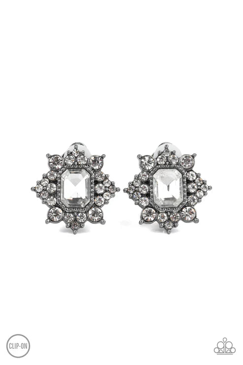 Featuring sleek gunmetal fittings, dainty white rhinestones coalesce around a glittery white emerald style rhinestone center for a stellar look. Earring attaches to a standard clip-on fitting.