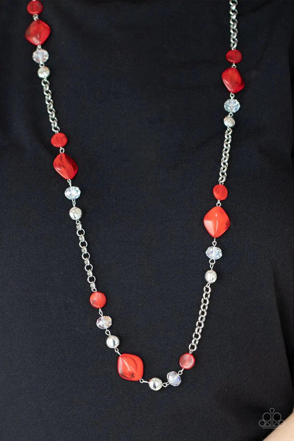 A shimmery collection of red glassy-like beads, faceted metallic-flecked crystal-like beads and flat silver beads connect along sections of silver chains, creating a whimsical display across the chest. Features an adjustable clasp closure.