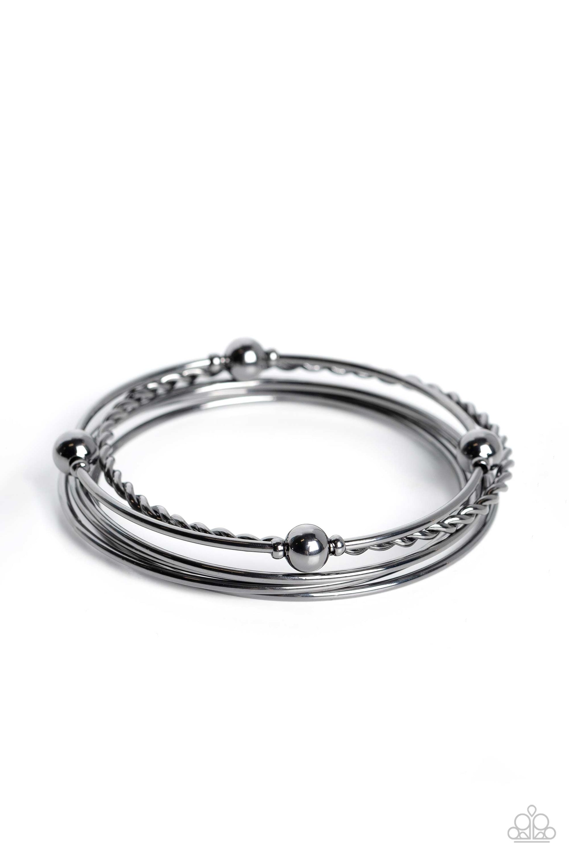A collision of sleek gunmetal bangles slides up and down the wrist for an industrially-layered look. One thin bangle features a braided texture, while another bangle features static gunmetal accents and spheres for a subtle, eye-catching artisan touch.
