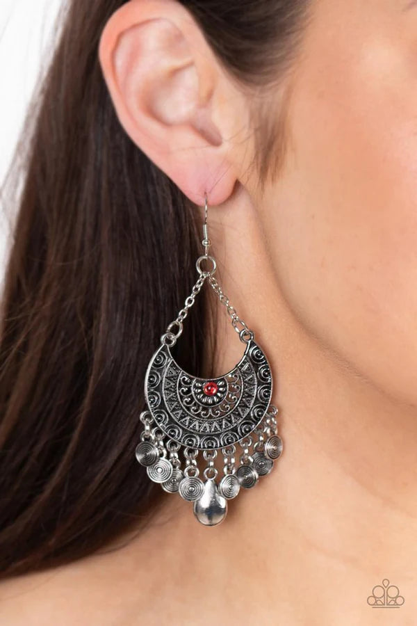 Dotted with a solitaire red rhinestone, row after row of tribal inspired patterns stack into a decorative silver crescent. Embossed with spiraling textures, dainty silver discs and a single silver teardrop frame swings from the bottom of the ornate frame for a noise-making finish. Earring attaches to a standard fishhook fitting.