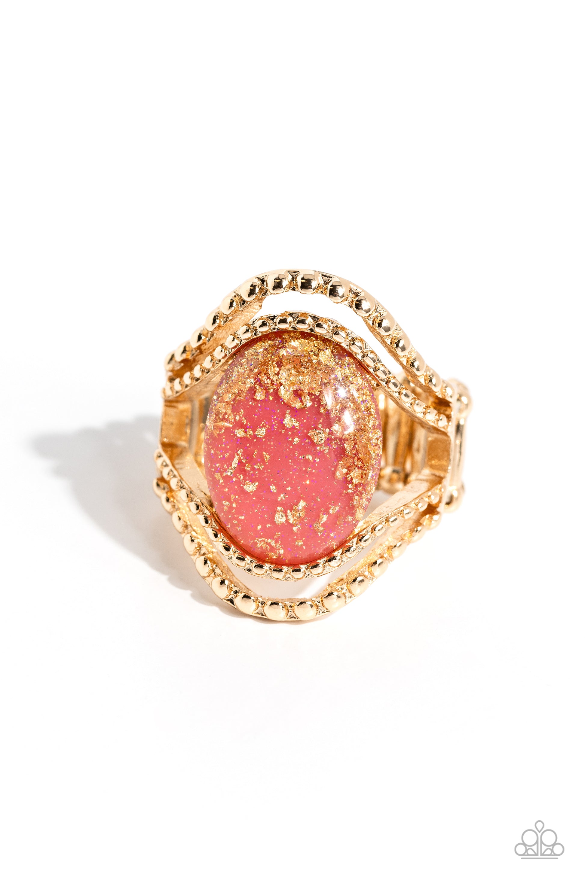 Encased in a studded, cresting gold frame, an oversized glassy pink bead with an opalescent finish, is speckled in flecks of gold shimmer for a bubbly, yet glitzy effect. Smaller, gold studs curve from the glassy bead, anchoring the oversized shimmer to the airy design. Features a stretchy band for a flexible fit.