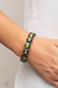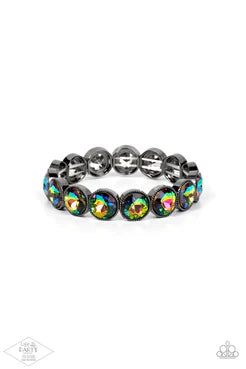 Faceted oil spill gems are pressed into sleek gunmetal frames. The glittery frames are threaded along stretchy bands, creating a glamorous look around the wrist.
