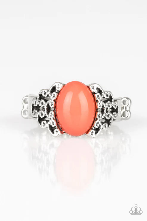 A refreshing Living Coral bead is pressed into the center of a shimmery silver band swirling with frilly filigree for a whimsical look. Features a dainty stretchy band for a flexible fit.
