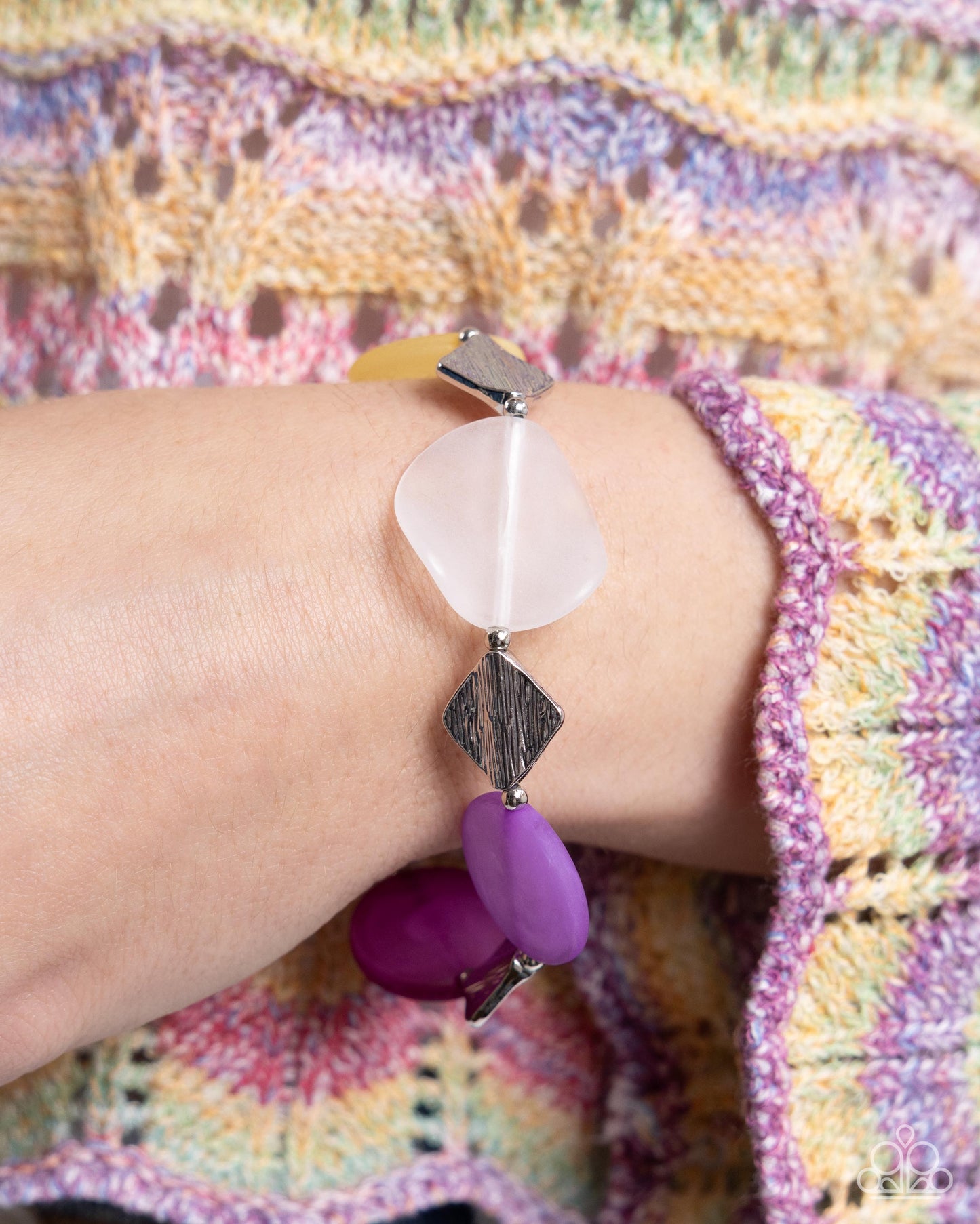 Infused along an elastic stretchy band, a collection of textured diamond silver beads, round silver beads, and clear, milky Orchid, Primrose, purple, and gray beads in varying shapes coalesce along the wrist for an artistic, animated look.