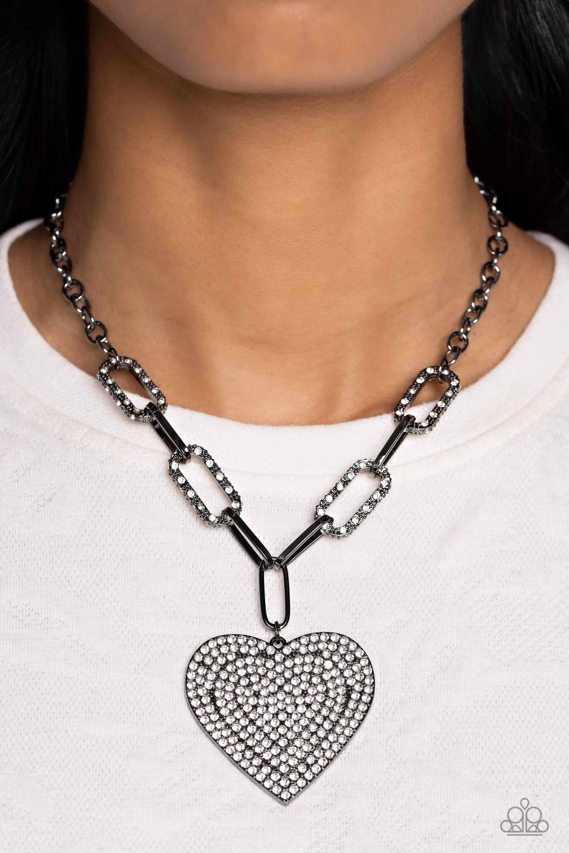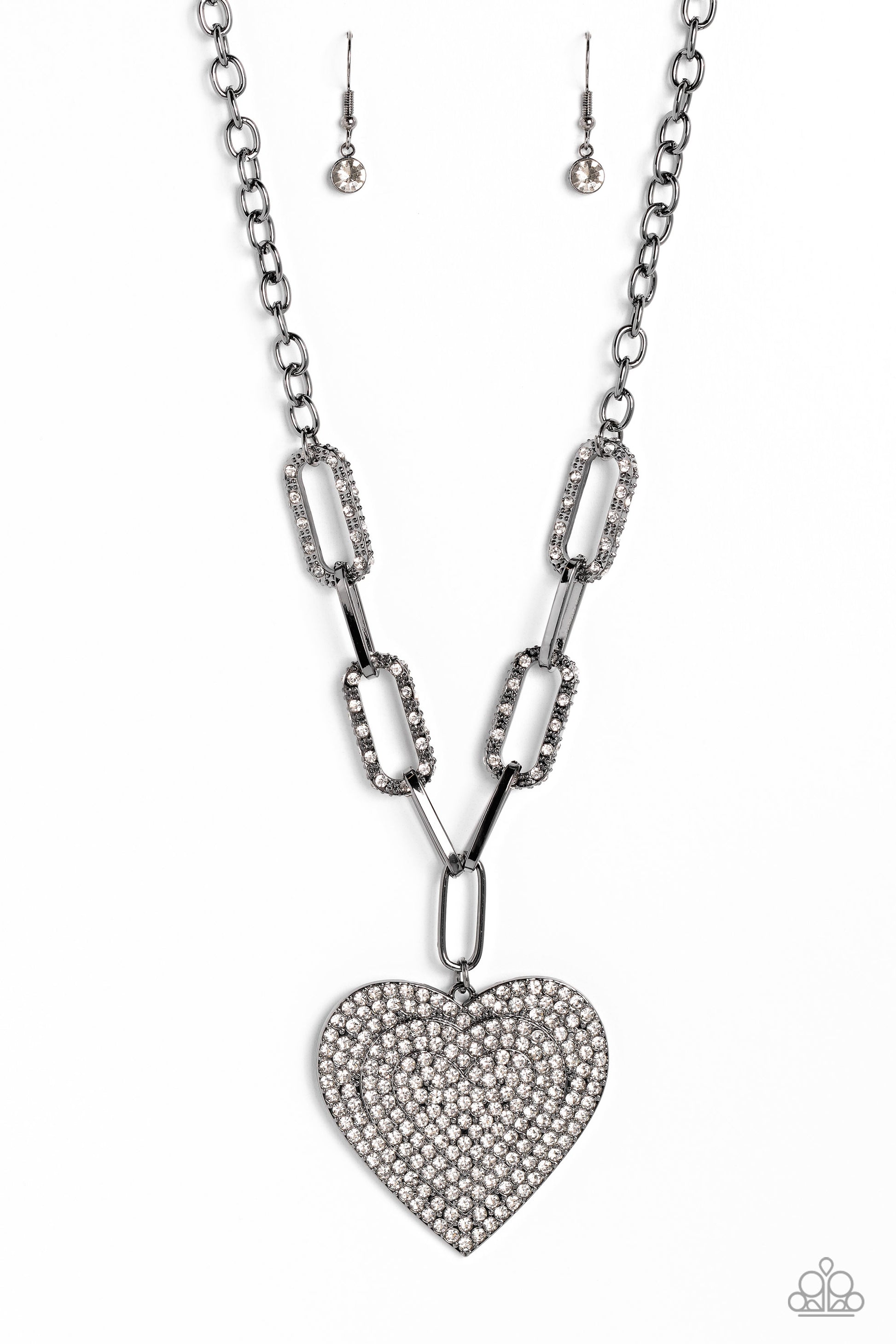 Elongated, oversized gunmetal links, encrusted with a blinding display of white rhinestones and shimmery gunmetal accents, connect a classic gunmetal chain to an exaggerated gunmetal heart pendant for a romantically refined finish. Featured on the oversized gunmetal heart, layers upon layers of glitzy white rhinestones emboss across its entire surface as the hearts gradually increase in size from the center. Features an adjustable clasp closure.