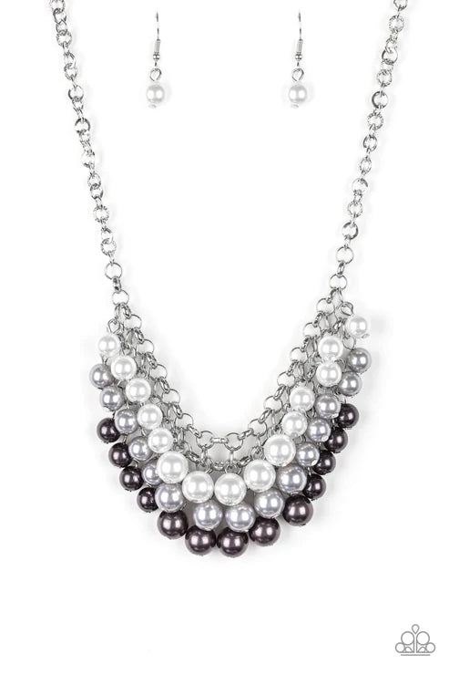 Rows of white, silver, and gunmetal pearls cascade below the collar, creating a glamorous fringe. Features an adjustable clasp closure.