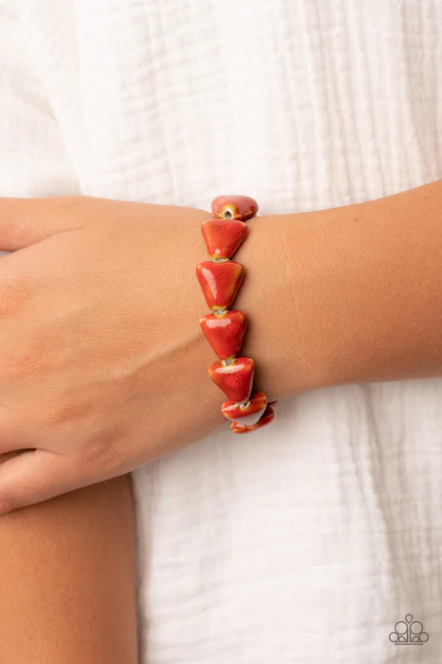Painted in a distressed red finish, ceramic beads shaped like shark teeth are threaded along a stretchy band around the wrist for a seasonal flair.