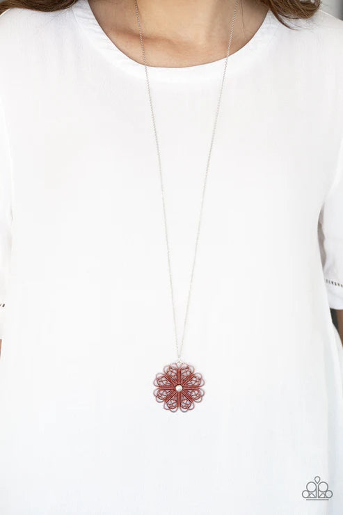 Brushed in a rustic red hue, filigree filled petals spin around a silver beaded center for a colorful look. The frilly floral pendant swings from the bottom of a lengthened silver chain for a whimsical finish. Features an adjustable clasp closure.