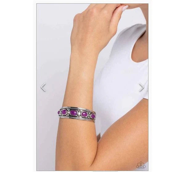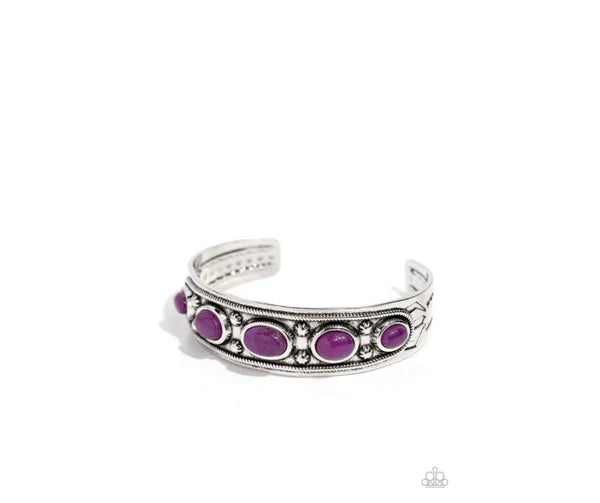 Set in oval silver frames, purple stone beads curl around the wrist atop a silver rope-textured and floral-embellished silver cuff for an artisan-inspired statement. As the stone elements in this piece are natural, some color variation is normal.