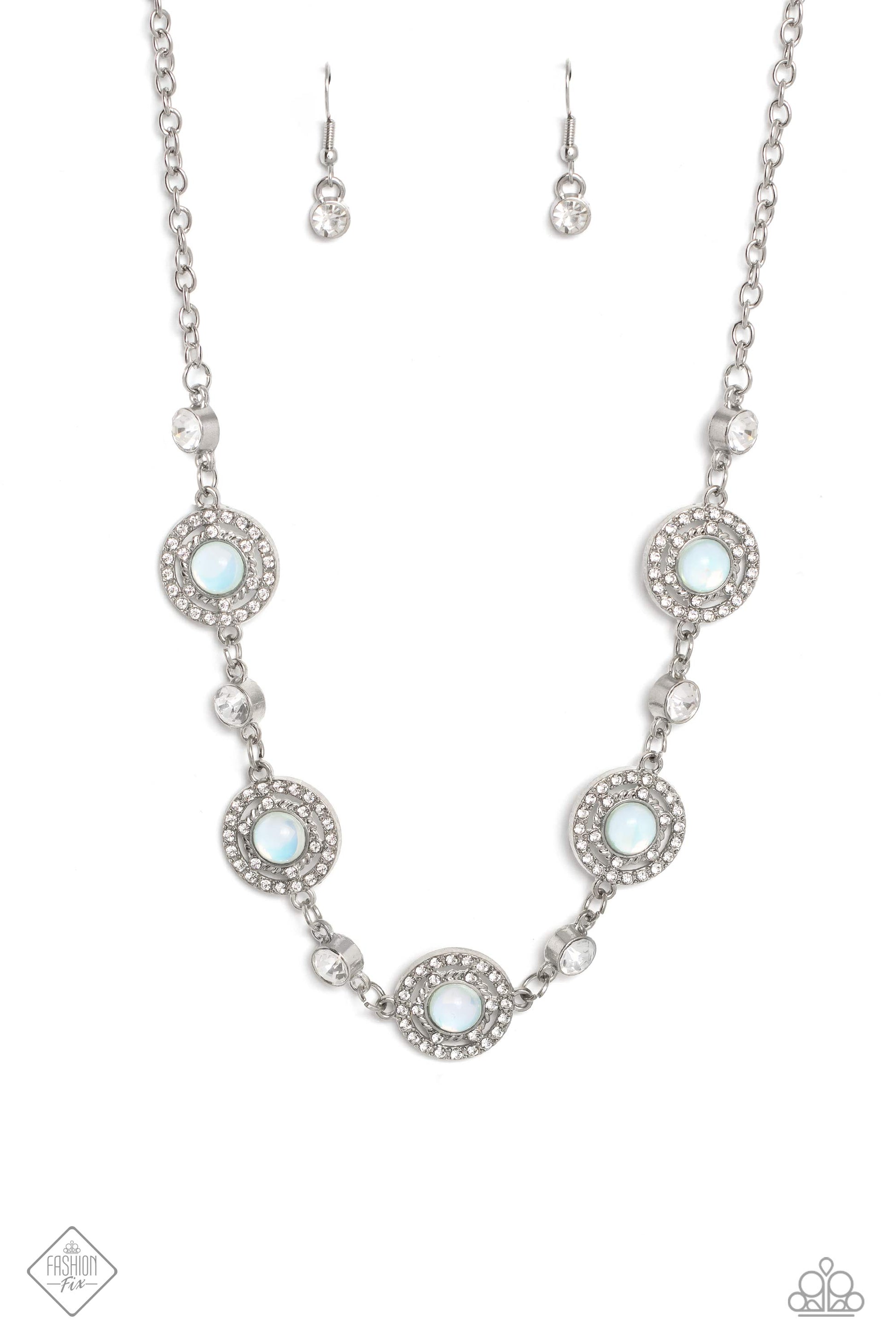 Solitaire white rhinestones alternate with rippling circular frames of silver dusted in dainty white rhinestones, creating an enchanting statement piece. Featured in the center of the scintillating frames, glassy, opalescent, green beads shimmer and shine from every angle as they fall along the neckline. Features an adjustable clasp closure.