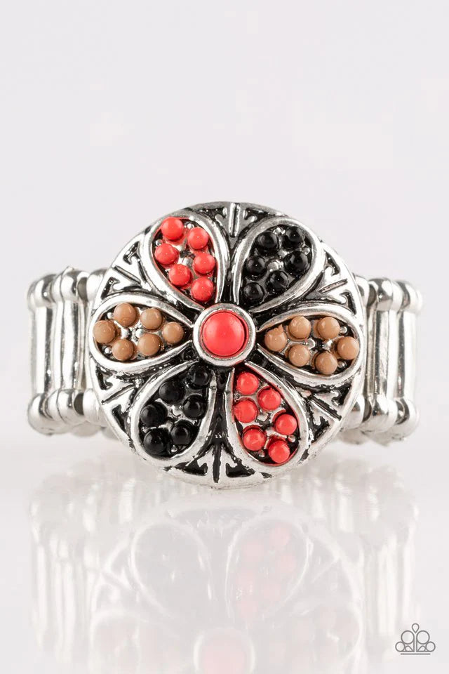 Dainty brown, black, and coral beads adorn the petals of a whimsical floral centerpiece for a seasonal look. Features a stretchy band for a flexible fit. Sold as one individual ring.