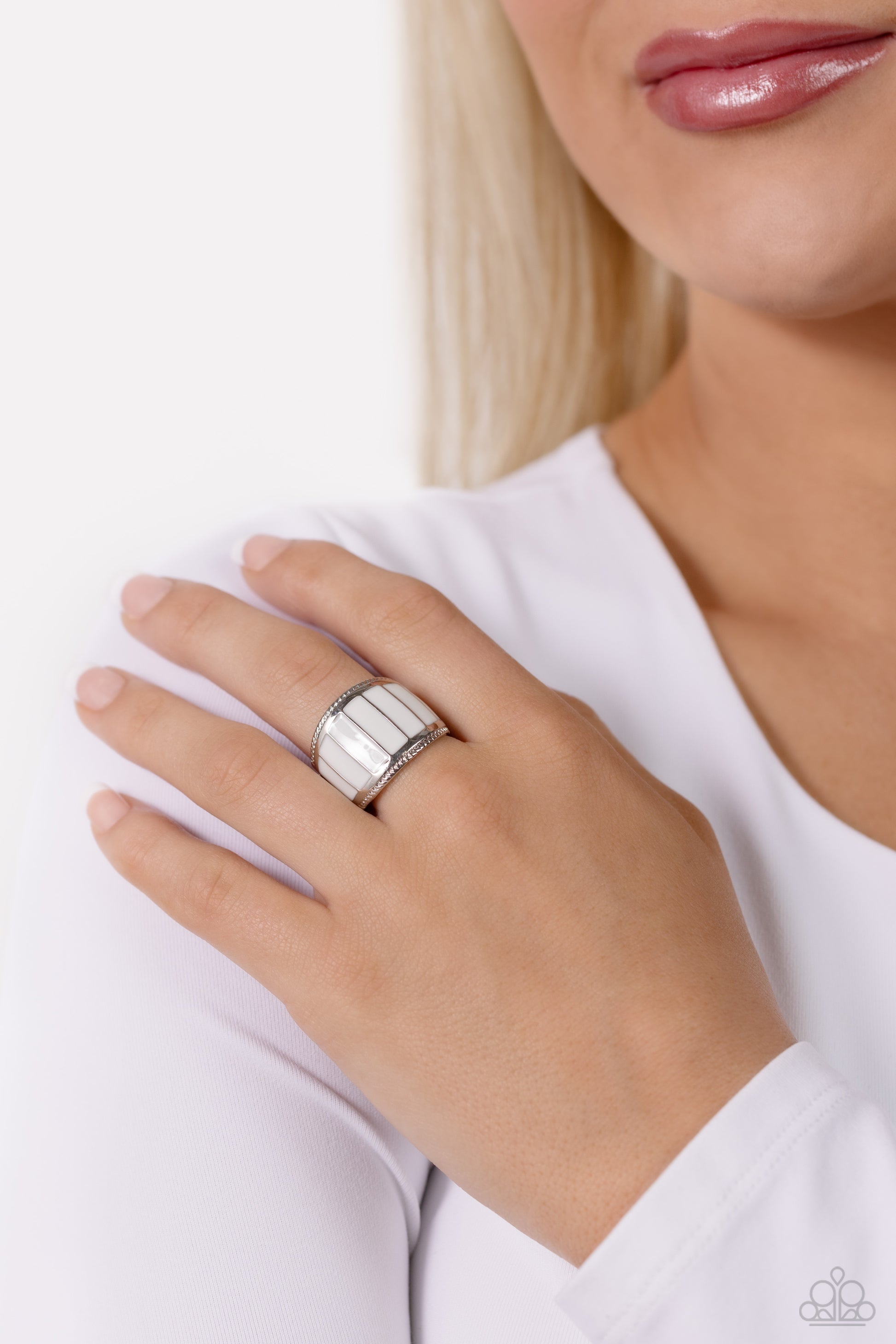 An oversized row of shiny white rectangular accents are bordered by textured silver bands, resulting in bold swatches of color across the finger. Features a stretchy band for a flexible fit.