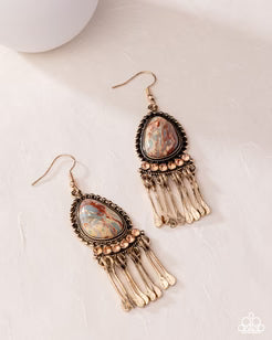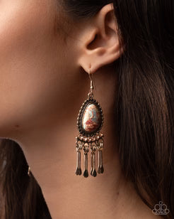 Pressed in a layered, gold-studded frame, an abstract Chili Oil-swirled stone stands out below the ear where a row of light peach rhinestones crowns a twist of gold texture, giving way to duos of flared gold bars for a mighty pop of color and eye-catching detail. Earring attaches to a standard fishhook fitting. As the stone elements in this piece are natural, some color variation is normal.