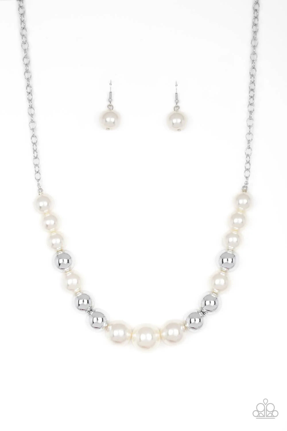 A collection of oversized silver and pearly white beads drape across the chest for a refined look. Features an adjustable clasp closure.