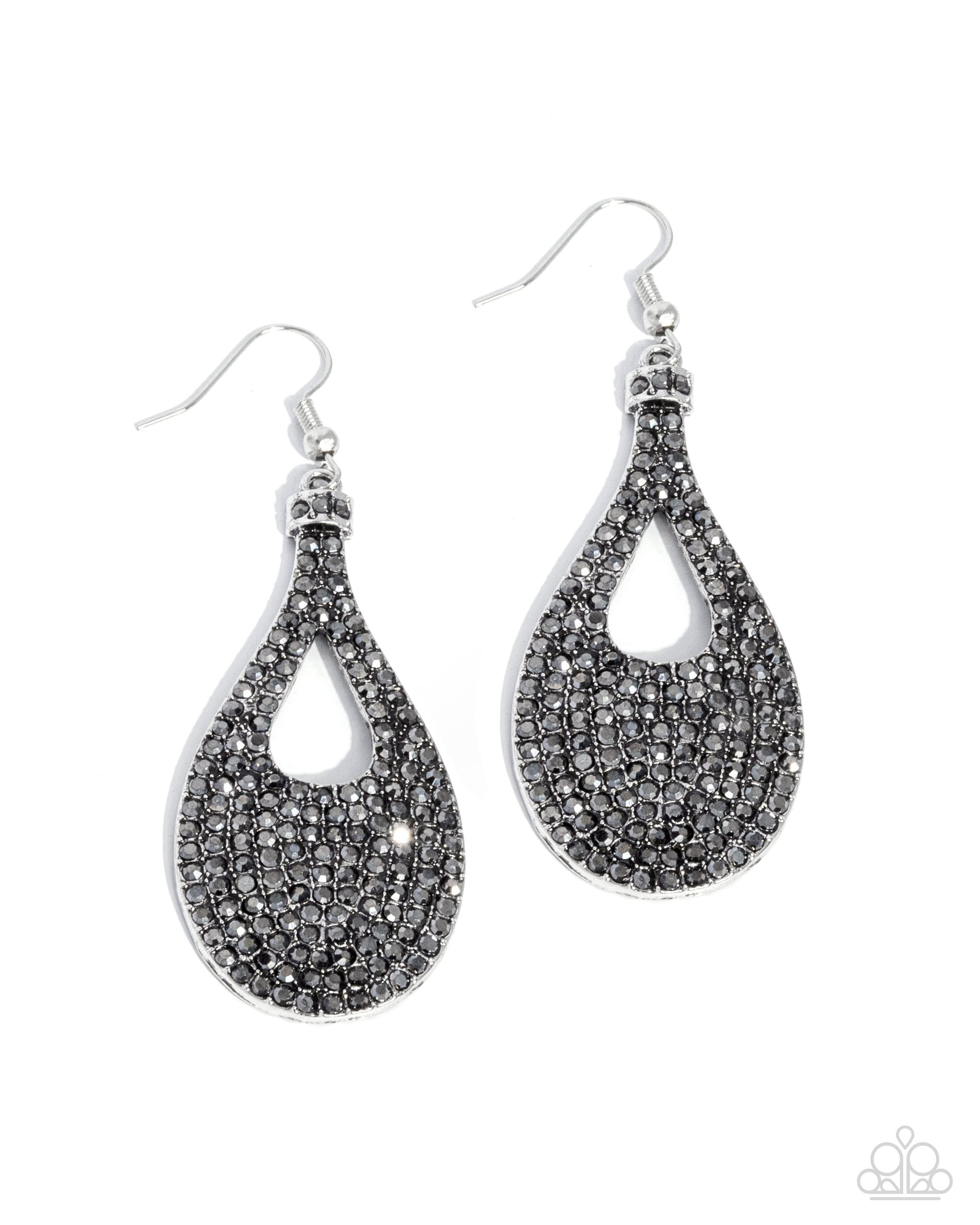 Smoldering teardrop frames, featuring a teardrop cut-out center, are encrusted with shimmery hematite rhinestones. Earring attaches to a standard fishhook fitting.