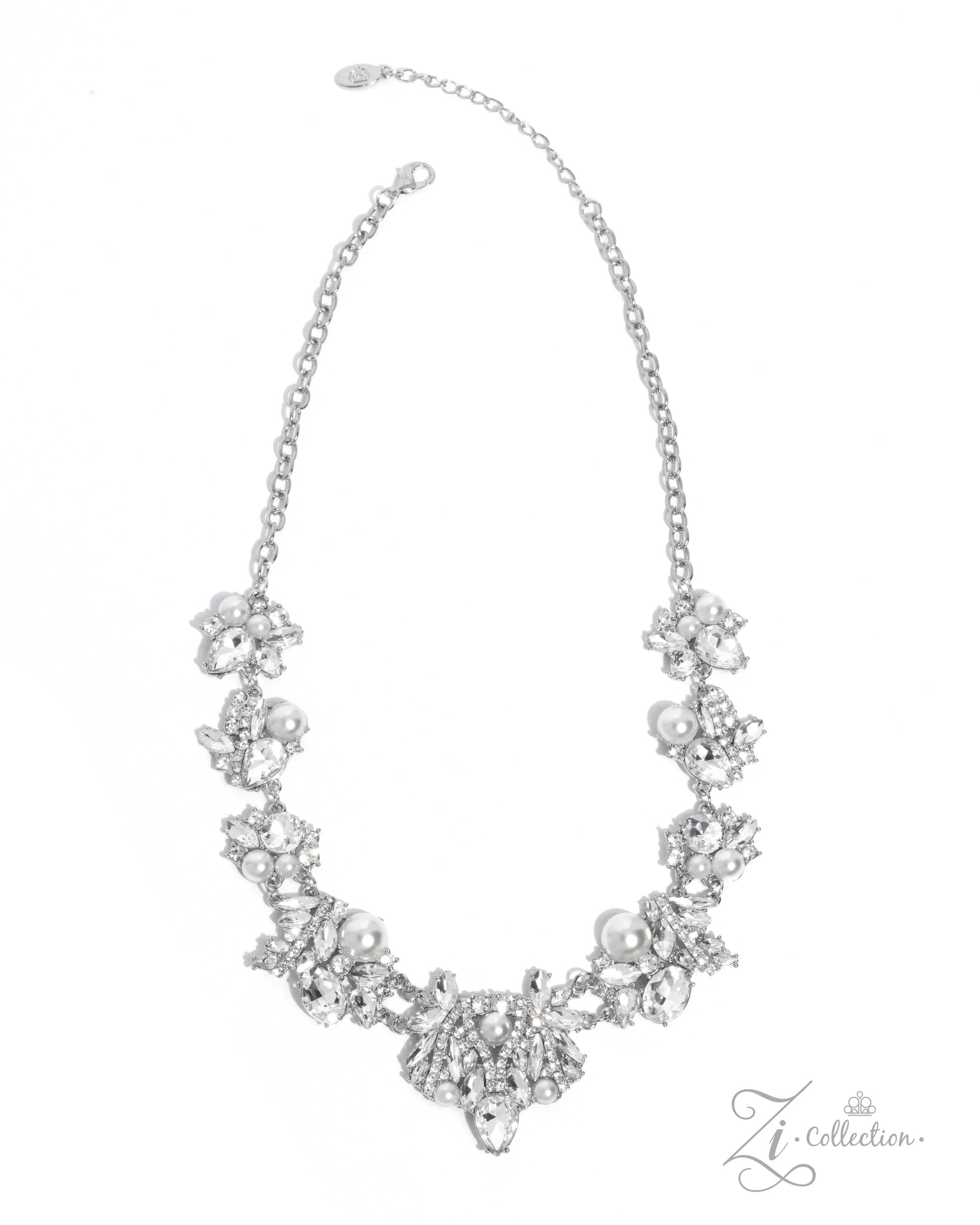 Clusters of marquise-cut and teardrop gems, round white rhinestones, white pearls, and pieces of rhinestone-encrusted silver bars link together along the collar, creating an explosion of extravagant sparkle. The dramatic angles of the silver bars exaggerate the dramatic crystal-like radiance of each pronged gem, adding further dimension to the design. The size and intensity of the radically refined clusters slowly increase as they lead to the center, where the eye rests at the fiercest focal point. Features an adjustable clasp closure.