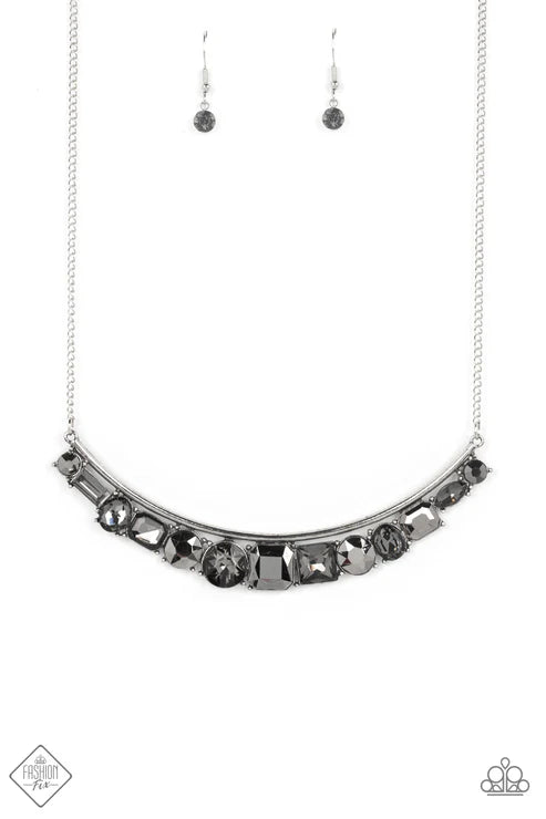 A curved bar of antiqued silver is trimmed with a mashup of sultry hematite and faceted smoky gems that shimmer inside studded silver frames, creating a scintillating sparkle below the collar. Features an adjustable clasp closure.