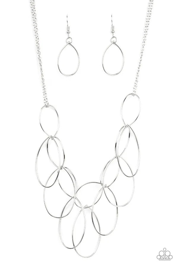 Shiny silver teardrops link below the collar. Large silver teardrops drip from the bottom, creating an airy fringe. Features an adjustable clasp closure.