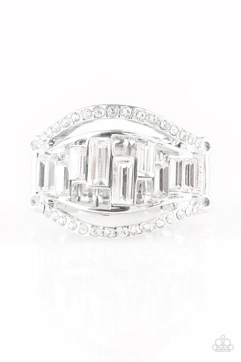 White rhinestone encrusted bands flank a row of emerald cut glass beads in shades of white for a regal look. Features a stretchy band for a flexible fit.