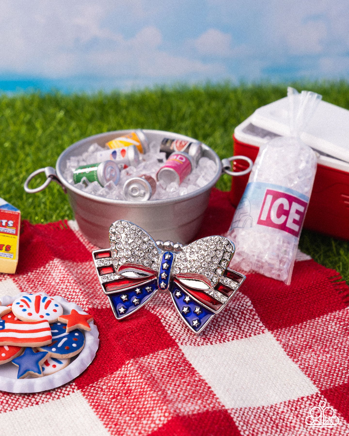 A patriotic-inspired bow flourishes atop the finger. Featuring brilliant white rhinestones, glossy red and blue painted stripes flare from the bow for a sparkling tribute. Features a stretchy band for a flexible fit.