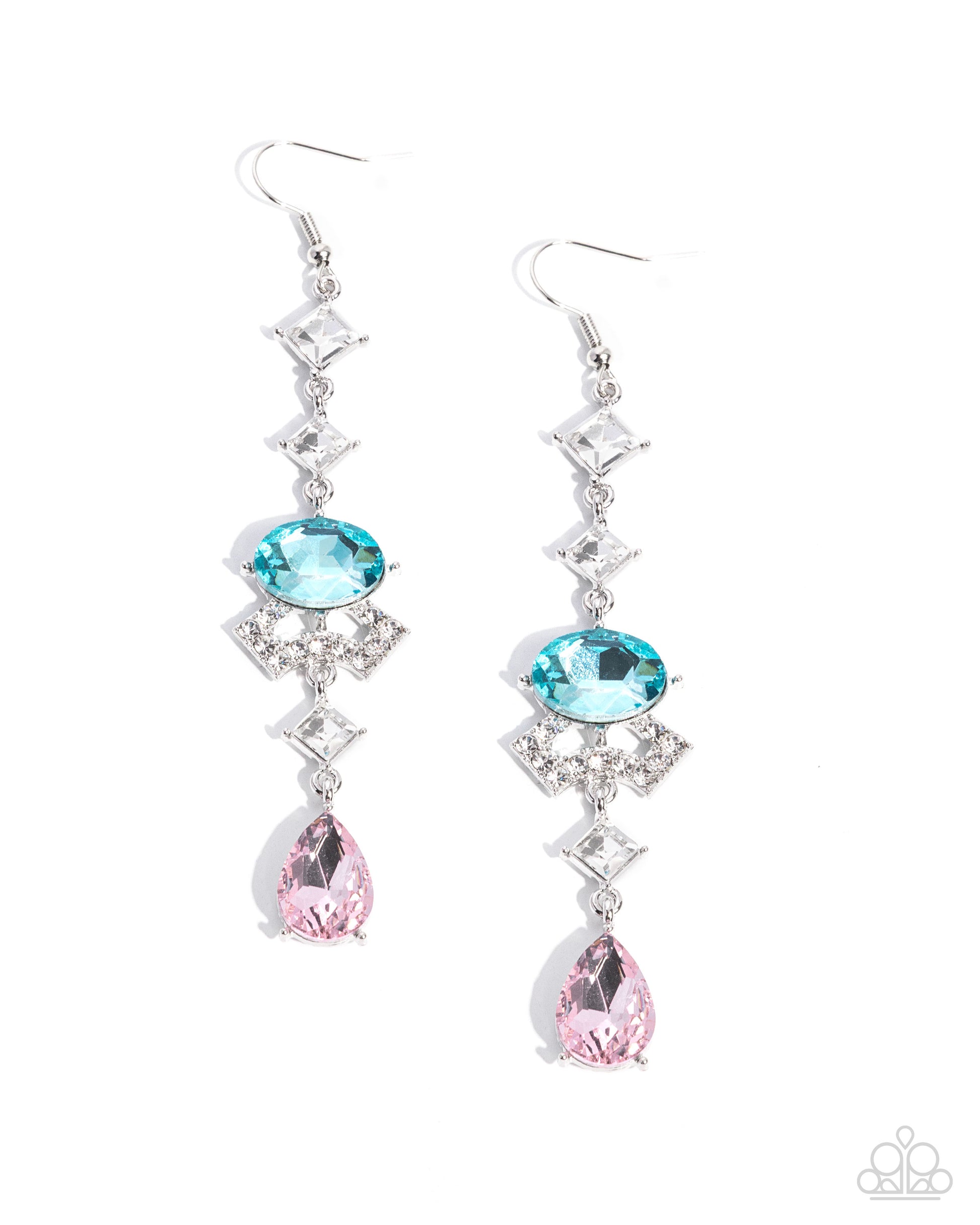 Square-cut white rhinestones link together to form an elegant vertical chain. A sparkling blue oval and a flared row of white gems add dazzling dimension, as a pink teardrop rhinestone glistens at the bottom for a final pop of color. Earring attaches to a standard fishhook fitting.