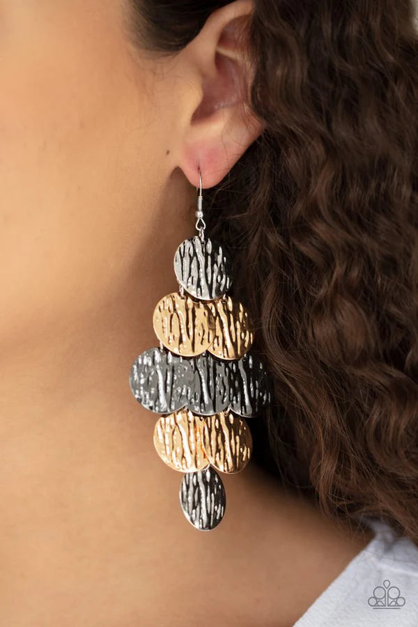 Embossed in rippling texture, a glistening collection of gold, gunmetal, and silver discs cascade from the ear for an edgy look. Earring attaches to a standard fishhook fitting.